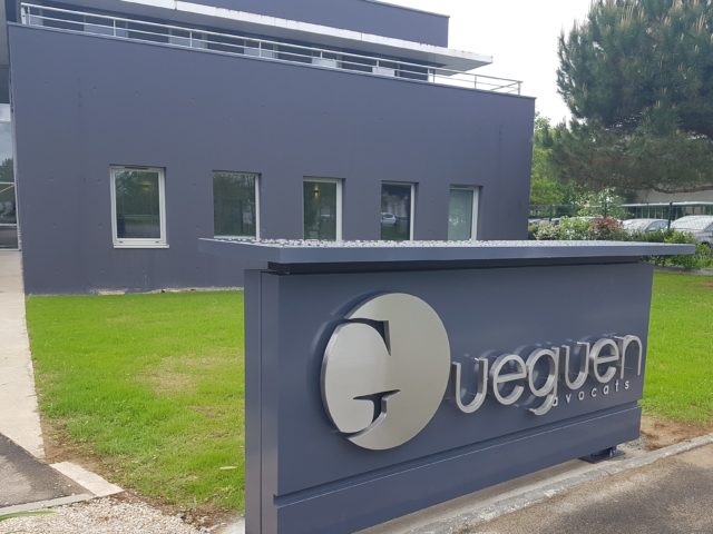 • Enseigne bandeau non lumineuse de 5.16 mètres x 0.56 m installée dans le prolongement de la première. Bandeau réalisé en tôle aluminium laquée gris avec positionnement du texte adhésif blanc et gris « Vos créateurs cuisinistes Thierry JEZEQUEL Anthony CUFF ».